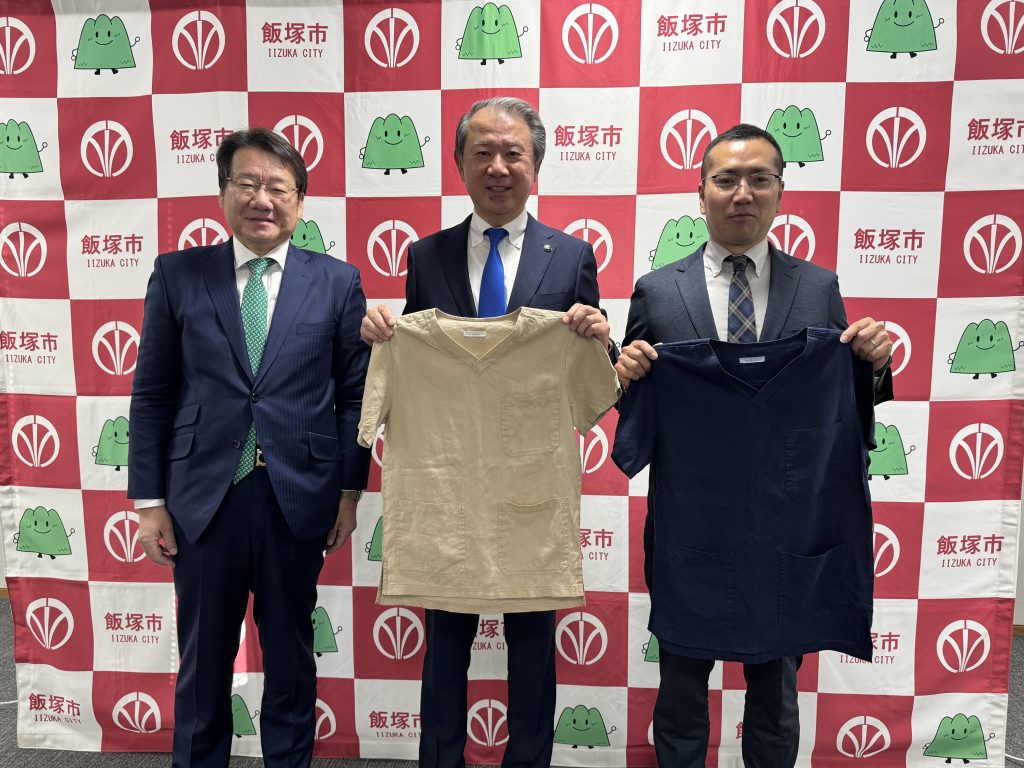 12月8日(月曜日)、飯塚市役所において、サステナブル医療ウェアブランド「sukui(スクイ)」が2025年度グッドデザイン賞を受賞したことを受け、株式会社ワーキングハセガワ代表取締役の長谷川伸一氏と、ブロックチェーン技術提供を行う株式会社chaintope CEO正田英樹が、飯塚市の武井市長を表敬訪問しました。