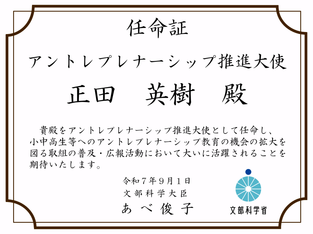 当社CEOの正田が、文部科学省よりアントレプレナーシップ推進大使に任命