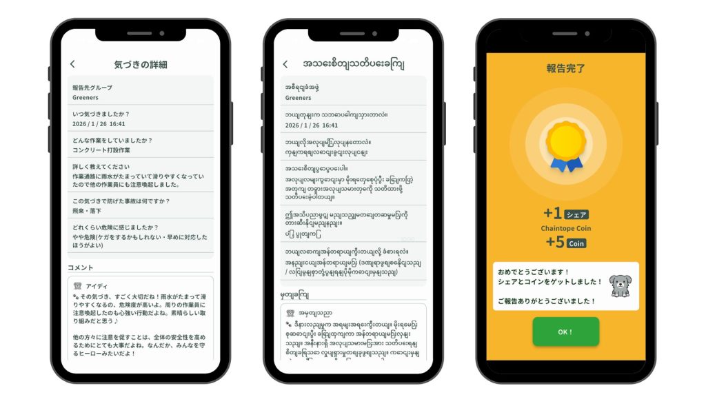 貢献行動(投稿や仲間へのリアクション)に対してコインを付与し、獲得数に応じて「賞金」として還元する制度を導入。「報告=メリット」という動機づけに加え、アプリ内での「いいね」や称賛が現場でのリアルな会話のきっかけとなり、楽しみながら安全意識を高める文化が醸成されつつあります。